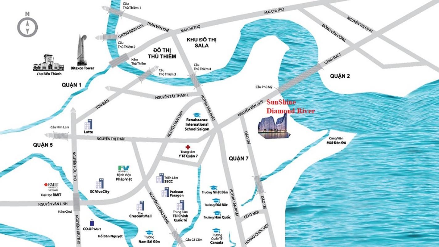 Tọa lạc ngay vị trí đắc địa, sát bên ngã ba sông Sài Gòn giao với sông Đồng Nai, cạnh cầu Phú Mỹ, 3 mặt kế cận nguồn nước mang lại sinh khí lộc tài, khu căn hộ cao cấp và trung tâm thương mại Sunshine Diamond River hứa hẹn mang đến phú quý, an lành cho những chủ nhân chọn nơi đây làm chốn an cư lạc nghiệp.